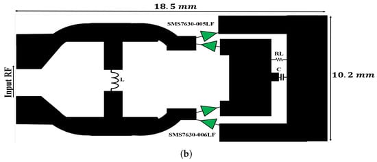 Because the diode nonlinearity, input power levels, input signal frequency, and output load resistance are leading to performance degradation of the rectifier over a wide operating frequency band, a pair of DRs (DR-A and DR-B) is used for maximizing the operating bandwidth as shown in Figure 4. The DR design is inspired from a previous work [30,35]. In this communication, BALUN is removed, allowing a direct connection to the ASDA input. Consequently, the impedance matching bandwidth is maximized and rectifier performance is maintained across a broad bandwidth.