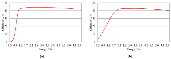 To achieve a broad bandwidth, two DRs are linked together. They are designated as DR-A and DR-B, as shown in Figure 6. DR-A is designed to operate across the band from 1–6 GHz. DR-A is manufactured using lumped elements L1, L2, L3, and C1, purchased from Murata Manufacturing Co. Ltd. (Nagaokakyo, Japan), and connected to two cascaded L-sections to provide broadband impedance matching. The value parameters (presented in Table 2) are obtained following a thorough optimization using the nonlinear harmonic balance simulation in the Agilent, ADS software. The input impedance of each rectifier is set as the ASDA input impedance . This impedance is obtained from the electromagnetic HFSS simulation of the ASDA without considering the BALUN connection. is exported from the HFSS and introduced as the input port impedance of the rectifier circuit. The simulated rectifier performance of DR-A is exhibited in Figure 7a. As noted from the figure, DR-A has 40% conversion efficiency over the band from 0.95–6 GHz. These results are obtained at = 9 dBm and = 1 k.