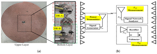 Photograph of the fabricated rectenna prototype and measurement setup, (a) Rectenna prototype showing both the upper layer (antenna) and bottom layer (rectifier); the rectifier is combined with two circuits DR-A and DR-B. (b) Measurement set-up with an antenna to determine the expected received power.