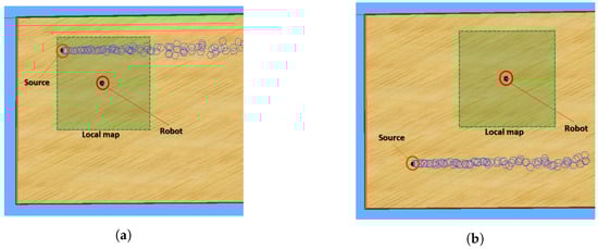 Gradient-based algorithms assume the plume to be a smooth concentration gradient, which could be the case in an environment without an airflow. For this class of algorithms, the robot needs to sample at different points in the environment while moving slowly to measure the long-term average of odor concentration at each sampling point []. Therefore, these algorithms, while being the most intuitive and computationally light ones, need relatively long time windows to find the source.
