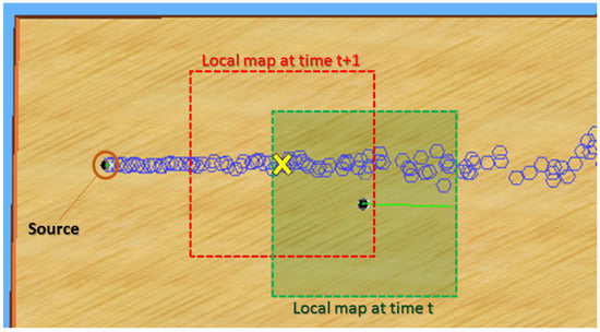 Figure 11a shows a sample trajectory of the robot in simulation. The samples are shown along with the robot’s trajectory. As expected, the robot took small steps and changed its course usually towards the source position. At the end, the robot stopped very close to the source where the algorithm reached its end.