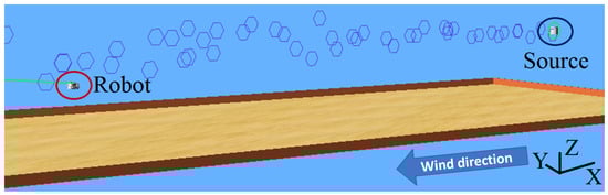Simulation environment in Webots, with the source upwind, the robot downwind, and the odor patches represented with blue hexagons.