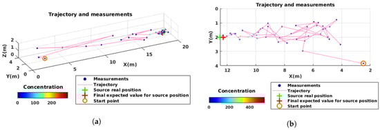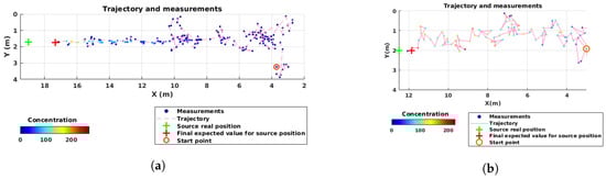 Two examples of robot’s trajectory in the global framework: (a) simulation; and (b) physical reality. The initial position of the robot, as well as the real position of the source and its predicted one are shown. On each sampled point, the measured concentration is indicated by the color of the circle, which corresponds to the averaged value of the measurements in a 5-s time window. The measured concentrations are relative values given by the sensor in mV.