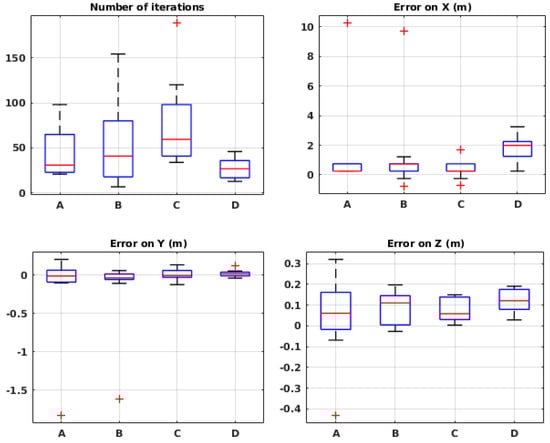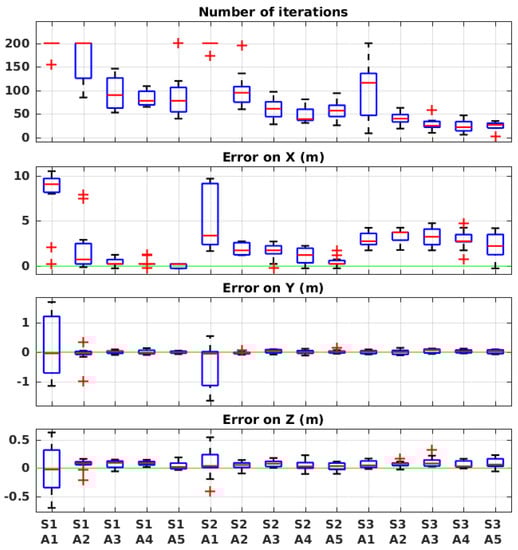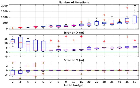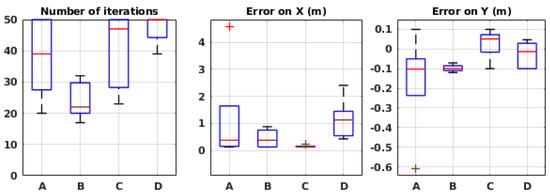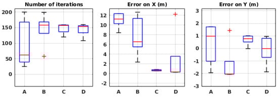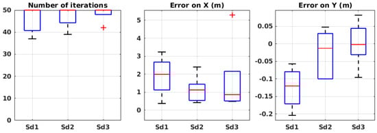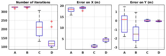 Figure 9 shows the performance of the algorithm with different values of . In these experiments, the maximum number of iterations was fixed to 50. With , the error on X and Y are very small, but the number of iterations is very close to 50. When the error on X is about 2 m on average, which is relatively high. This is why the middle value, 125, was chosen for the rest of the experiments.