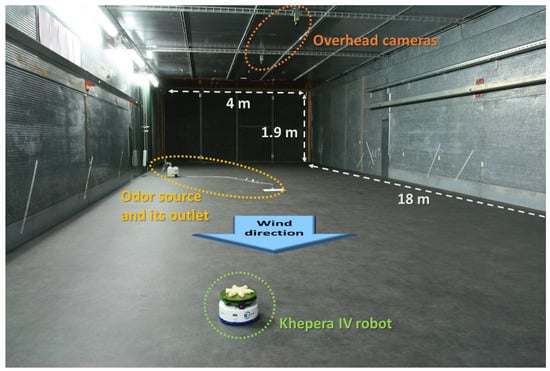 To evaluate the performance of the algorithm in a repeatable fashion, our experiments were carried out in a wind tunnel of volume , which provides a controllable wind flow. The wind tunnel is designed in such a way that the wind passes first through a flow straightener that consists of a set of narrow tubes of 10 cm in diameter, assembled in a honeycomb-like structure. The resulting Reynolds numbers after the honeycomb would be between 4000 to 6000 for the considered wind speed range and a temperature of C. However, the flow gets further laminarized through a very fine-structured filter, right before entering the main chamber where experiments are carried out. Given the design of the wind tunnel and the experimentally observed data, we assumed that the resulting air flow is quasi-laminar. A Khepera IV robot, equipped with an olfaction sensor MiCS-5521 CO/VOC [] as well as a wind sensor board [], ran the algorithm autonomously. Overhead cameras in combination with the SwisTrack software [] were used for tracking the robot pose in the wind tunnel, enabling both the implementation of an absolute positioning system when the localization information is sent back to the robot in the global framework algorithms and, for both algorithmic frameworks, as ground truth system for performance evaluation. The localization information was sent back to the robot to be used in the algorithm in the global framework. The odor source was emulated using an electric pump vaporizing ethanol. An illustration of the wind tunnel with the deployed equipment is presented in Figure 8. Since the mobility of the robot is only in 2-D, the source localization error was only calculated on the X- and Y-axis.