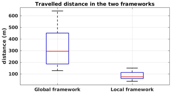One advantage of the local framework that we did not address is the low travelled distance. In Figure 15, the total travelled distances in both frameworks are shown in simulation in condition C. It appears that, in the local framework, on average, the robot moves three times less than in the global framework. The limited navigation strategy in the local framework, on the one hand, and the large exploration steps in the global framework, on the other hand, are the causes of the difference between the two frameworks.