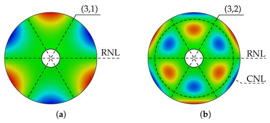where n reflects the number of RNLs and m the number of CNLs. An example is given in Figure 1 and displays the two mode shapes (3,1) and (3,2) of polar orthotropic rotor–discs derived from numerical analysis.
