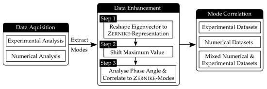 At the beginning the mode shapes are extracted from the examined PSDs. Subsequently the mode shapes are processed in three different steps that aim to improve the mode correlation, by reshaping the modes based on Zernike modes (Step 1), considering geometrical symmetry (Step 2) and the complex phase angle of the eigenvectors (Step 3). A method that associates mode shapes of changing conditions can be applied additionally and helps to reduce double modes. The method allows for the determination of frequencies that can be associated to valid eigenmodes or otherwise have to be considered invalid. The data enhancement includes several methods utilized to specifically improve the representation of the mode shapes. The data correlation can be performed between experimental or numerical data only, or in combination. In literature, the combined approach is often called mixed numerical experimental technique, which is used for example in the field of aerospace engineering []. The main focus of this paper is the mode shape enhancement to improve the results of the previously mentioned correlation methods. Each sub-function of the enhancement method is described in detail in the following sections.