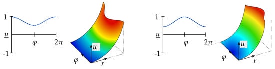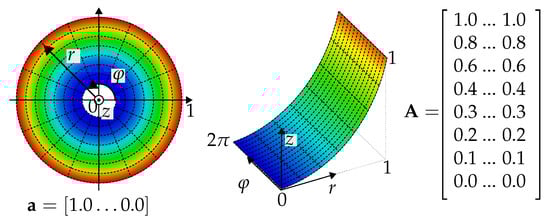 It is therefore possible to adequately describe each mode shape by using two polynomials or two interdependent mode representations. To determine these, the rotor is conceptually cut along an RNL and unfolds, resulting in a rectangular surface with the dimensions , with . Following a path along one edge, for instance, along the radius, and meanwhile recording every vertical line, a vector of polynomials for every CNL can be created. Conversely, the vector of the RNLs is obtained by following a path along a CNL. In Figure 3, for instance, the fictitious vector , containing real values in the range of , is reorganized according to the former described procedure, which leads to the matrix .