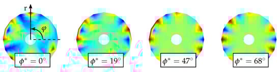 Restraining a structure causes local stiffening, thus resulting in frequency shifts and hinders the formation of mode shapes. Therefore, another method was implemented that also uses the Zernike modes to identify the restrained DOFs allowing for the approximation of the resulting displacement distribution. Since rotors are rotationally symmetrical structures, the transfer into matrix form by separating discs along one radius line results in symmetrical boundary conditions that are represented by the outer columns of the matrix. The amount of shifts is equal to twisting a mode shape by a specific angle around its central axis. For instance, shifting the columns of a matrix by half the total number of columns represents an angle twist of . Non-symmetric structures can exhibit mode shapes that appear to be similar but with values shifted along one dimension. Taking into account the restrains described above, further mode shapes can be excluded with a given symmetry of the structure. In addition, the progressions of possible mode shapes can be calculated under consideration of the sampling theorem [] and the correlation between familiar and all possible mode shapes can be determined by the former described MAC.