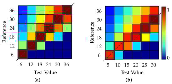 Frequency deviation correlation for (a) identical and (b) different pairs of input values and highlighted maximum correlation values in grey.