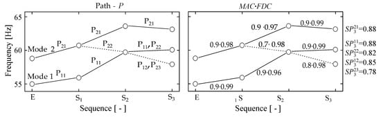Paths derived from sequential determined frequency shifts of multiple modes (left) with associated modal assurance criterion (MAC) and frequency deviation correlation (FDC) values (right).
