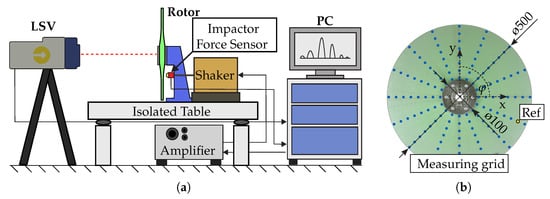 (a) Schematic set-up of the measuring equipment used in experimental modal analysis according to [] and (b) rotor with measuring grid and dimensions.