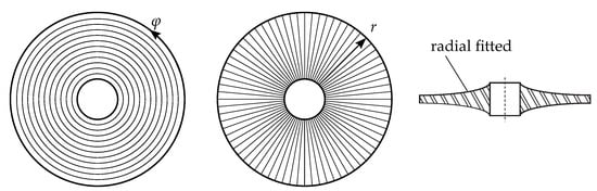 The layers of the investigated rotors consisted of radially and tangentially arranged glass fibres, which were placed by means of tailored fibre placement. The preform consisted of several fibre layers and was produced from so-called textile sub preforms. The fibre orientation was radial (Ra) and tangential (Ta) and thus showed a polar orthotropic alignment, resulting in a planar, polar stress distribution along the radius r and circumference or angle respectively. The rotors featured a symmetric composite lay-up of Ra/Ta/Ra/Ra/Ta/Ra. The preforms were consolidated using the resin injection moulding process and a specifically designed mould that allowed for even material distribution, resulting in a double concave profile, decreasing in thickness from the inside to the outside as shown in Figure 9. In the following, results were evaluated to which the mode shape correlation of different measurements is of importance.