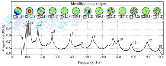 The measurement of structural conditions is always subject to external influences. Furthermore, the use of filters, window functions and averaging procedures can lead to errors that have an unintended effect on the transfer function; for example, frequency spectra can be averaged in absolute or complex terms. With absolute averaging the phase relation is lost and in this case the result is sometimes combined with the phase response of any spectrum. Since phase responses are subject to similar fluctuations as the frequency spectra themselves, there is a deviation in the transfer function. Thus, the amplitude and phase angle of a complex eigenvector are no longer in correct relation to each other. A further difficulty is the superposition of mode shapes, which arises e.g., through a combination of several successive modes caused by signal noise, signal interference, uneven excitation etc. Mode shapes with higher radial node numbers are especially more prone to be affected, since they do not necessarily have to be close to a mode shape with the same circular node number. Another issue can be closely spaced mode shapes were several mode shapes appear at nearly the same frequency. Since the appearance of this phenomena was marginal in the considered setup, solving this issue is not a goal of this work. Nevertheless, a suggestion is made in Section 2.6 describing a possible solution.