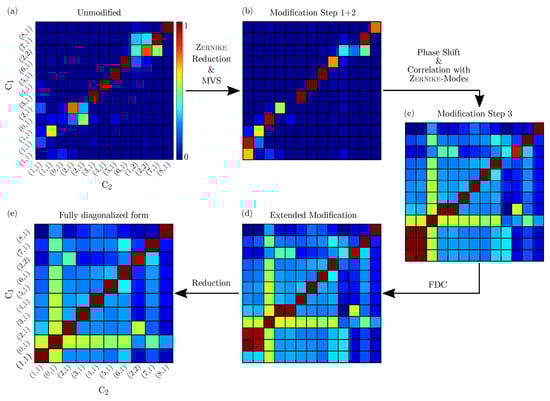 Several MAC matrices illustrate the correlation results of a rotor between two different conditions C and C and with different optimization methods applied, originating from unmodified eigenmodes (a), followed by enhancement methods such as Zernike reduction and maximum value shift (MVS) (b), phase angle modulation and direct correlation to Zernike modes (c), the extended correlation method FDC (d) and a final reduction steps (e).