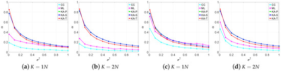 Figure 1 illustrates that for the proposed estimators, the clutter environment and the number of secondary data have a little impact on the weighting factor. The proposed estimators are more sensitive to . When becomes large becomes small to keep the estimation accuracy. Therefore, the proposed estimators have the robust estimate property. The change in of the KA-P and KA-S estimators show that these two estimators have similar performance in estimation. For the CC and ML estimators, the clutter environment has a significant impact on the weighting factor. Especially, in the compound-Gaussian clutter (Figure 1a,b), though the prior covariance matrix is accurate the weighting factor of the CC and ML is small. Therefore, the CC and ML estimators can not make the most of the prior knowledge under the compound-Gaussian clutter. Moreover, as the increases, all the estimators tend to abandon the inaccurate prior knowledge. Therefore, all the KA methods can recognize the invalid knowledge.