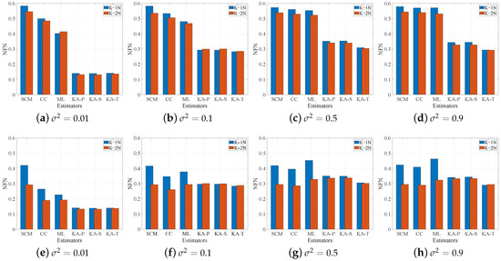 We calculate the mean of 1000 Monte Carlo experiments of the NFN to obtain the NFN estimation values of each estimator, shown in Figure 2. From the estimation error results in the compound-Gaussian clutter (Figure 2a–d), we find that the SCM estimator suffers from significant performance loss, and hence the CC and ML estimators using the SCM as the basic estimator have serious estimation error, though the is small. For the proposed estimators, in the compound-Gaussian clutter, the KA-T estimator has the smallest estimation error, which suggests that the KA-T has the best detection performance among the proposed estimator. Compared with the SCM, CC and ML estimators, the proposed estimators have better estimation accuracy than them in the compound-Gaussian clutter. In the Gaussian clutter (Figure 2e–h), the estimators have similar estimation accuracy when . When , the proposed estimators have better estimate results than the SCM, CC and ML estimators.