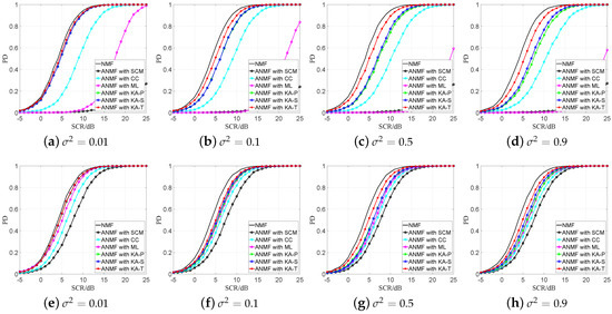PD versa SCR with different values of the perturbation level in Gaussian clutter PFA = 10−3, (a–d) K = 1N; (e–h) K = 2N.