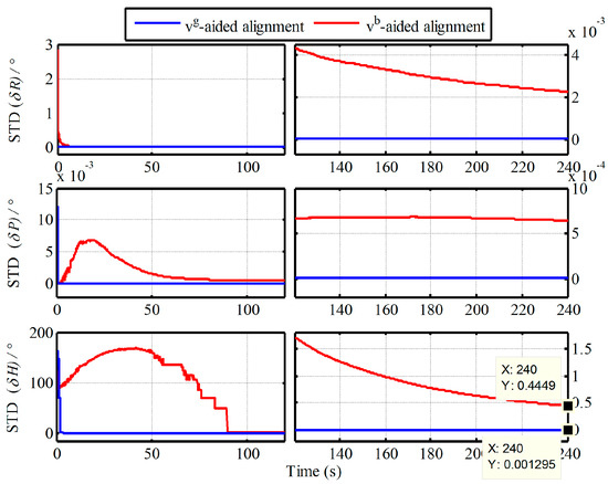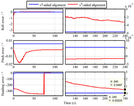 where the is the vehicle speed, denotes the white noise. While the external aided velocity information is provided directly by the SINS simulator. Then, the alignment results of IMADA aided by and are shown in Figure 2.