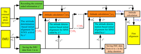 According to the above description, the multistage attitude determination alignment with different velocity models can remove the principled model errors and decrease the calculated errors, thereby improving the alignment performance of traditional -based IMADA. On the other hand, suppose the time index of the IMU data is saved from m to s during the reciprocating delay process. Then the current attitude matrix can be also obtained by attitude calculation as shown in Figure 5. And then the process of fine alignment can also be carried out. Moreover, the procedure of the designed multistage IMADA method can also be summarized. Suppose the N-levels alignment process () is applied, the implement steps are listed as follow.