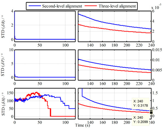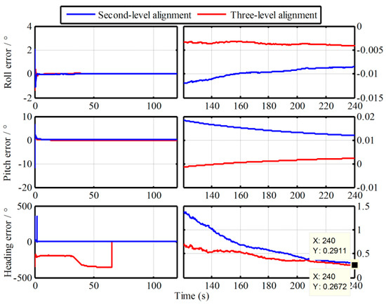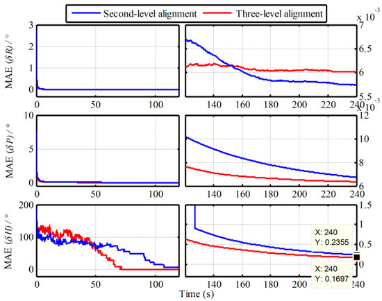 In order to verify the superior performance of the proposed algorithm, simulations is conducted in this section. With the same IMU data in Section 2.4, the proposed multistage attitude determination alignment is carried out with both the second-level alignment and three-level alignment. Namely, only the alignment algorithms of the -based IMADA associated by one -based IMADA or two -based IMADAs are implemented. The alignment errors curves of three-axis are shown in Figure 6.