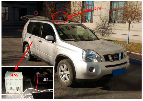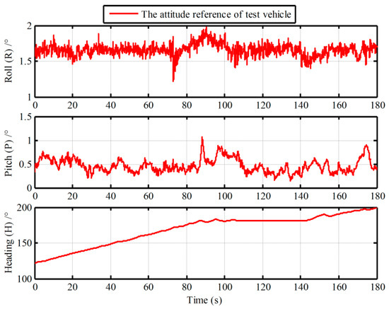 In this section, the vehicle experiment was carried out to demonstrate the advantage of the proposed algorithm, as shown in Figure 9. In the vehicle experiment, a differential GPSs and a Fiber Optic Gyroscope (FOG) SINS are equipped. The gyro constant drifts and the accelerometer constant bias of the test FOG SINS are less 0.01 °/h and 100 µg, respectively. A 180s data segment of In-motion IMU is utilized. The local latitude and longitude of vehicle are 45.7778° and 126.6778°. In the process of initial alignment, the external aided velocity information is provided from the SINS/GPS integrated navigation system. While is obtained from the GPS. And the velocity error of GPS is 0.05 m/s (Root Mean Square—RMS). Meanwhile, the attitude outputs of the integrated navigation system are served as the reference of the IMADA coarse alignment. And the true attitude reference of vehicle experiment is shown in Figure 10. With the -based IMADA, the traditional -based IMADA, the proposed second-level alignment and the proposed three-level alignment respectively, the alignment results are shown in Figure 11.