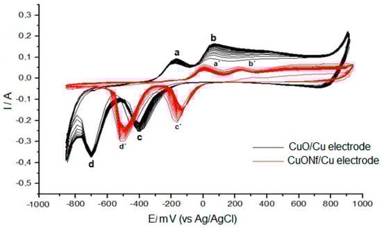 Cyclic voltammograms of CuO electrochemical formation at Cu electrode (black line) and Nf/Cu modified electrode (red line) at 100 mV s–1, 50 cycles. Electrolyte solution: 0.1 mol L–1 NaOH.