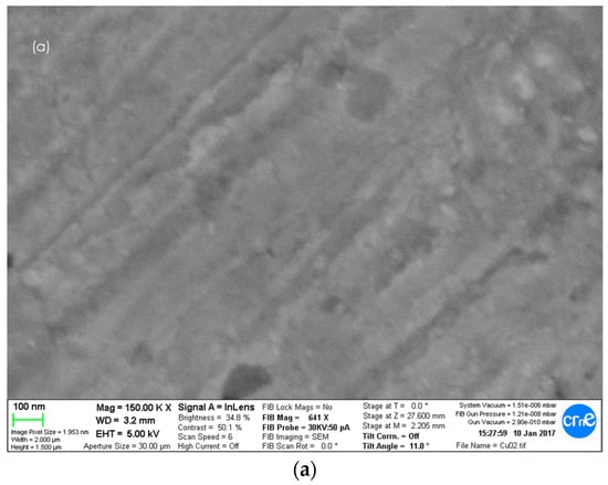 A number of metals in alkaline media can electrocatalytically oxidize a wide range of organic compounds. We chose Cu as the substrate of our electrodes due to its demonstrated capability as an electrocatalyst for oxidation of the major organic contaminants contributing to COD in water systems, as already mentioned []. This Cu catalytic action is mediated by surface oxides, which are easily formed in ambient air or under anodic conditions [,,,,,]. Several studies for the electrocatalytic oxidation of Cu bare electrodes in alkaline media have been carried out using different techniques []. This electrochemical process is highly dependent on both the hydroxide concentration and the previous formation of a specific layer of Cu(II) oxide. The participation of Cu(III) species as an electron transfer mediator has been suggested to explain the good performance of Cu electrode in alkaline medium in anodic processes, related to several organic compounds [,] in agreement with the following reactions: