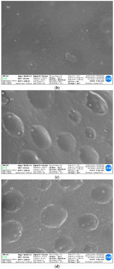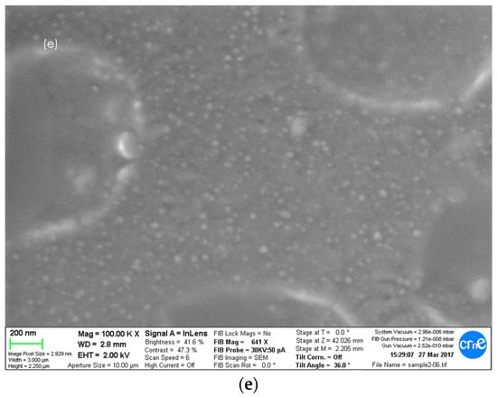The surface morphology of the electrodes before and after modification by CV was studied by SEM. Results are shown in Figure 2. The image of the CuO/Cu electrode exhibits CuO particles which appeared to be uniformly spread over the entire electrode surface (Figure 2b). The particles, composed of 30 nm sized granules, look amorphous in structure and shape. The surface of the electrode looks rough and very different from that of the bare Cu (Figure 2a). Nafion forms a film over the substrate’s surface as shown in Figure 2c, with uniformly distributed oval bulges. Figure 2d,e illustrate the low and high SEM image magnifications of the CuONf/Cu electrode obtained after 50 voltammetric Nafion deposition cycles. It shows that the surface is covered by microspheres consisting of nanoparticles, ~36 nm diameter, stretching along different directions on the electrode surface as seen in Figure 2e. Nano-sized channels can be seen to exist between the nanoparticles which could allow for easy diffusion of the electrolyte into the electrode’s surface and out of it.