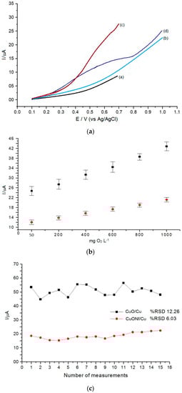 Glucose was used as a standard organic compound for further analytical evaluation of the modified electrodes. Figure 3A, compares the electroxidation behavior of glucose using the CuO/Cu (curves “c”) and using the CuONf/Cu (curves “d”) sensors after linear sweep voltammetry in a 0.1 mol·L−1 NaOH solution. Using the CuONf/Cu sensor the oxidation potential of glucose shifts positively, i.e. increases, and the oxidation current decreases as compared to the current using the CuO/Cu sensor. The CuONf/Cu sensor exhibits an enhancement of the potential window for the electrochemical oxidation of glucose, resulting in the decline of water oxidation which otherwise would be the main reaction. It was found that the oxidation current signal of glucose is higher using the CuO/Cu sensor than using the CuONf/Cu modified sensor, but measurements were more reproducible using the CuONf/Cu sensor. It was found that the oxidation current signal at ~0.70 V is proportional to the concentration of COD (C, mg·L−1 of O2) over the range from 50 to 1000 mg·L−1 (Figure 3B). The values of the calibration curves were obtained considering the oxygen concentration consumed in the theoretical oxidation of glucose solutions of exactly known concentration according to C6H12O6 + 6O2 ⇄ 6CO2 + 6H2O. The difference between the theoretical concentration of oxygen produced and the measured oxygen concentration, keeps a linear relationship with the COD values of the sample analyzed. As shown in Figure 3B, the standard deviation of measurements is higher using the CuO/Cu modified electrode, confirming that reproducibility of the measurements with the CuO/Cu electrode is worse than using the CuONf/Cu electrode as visually appreciated in Figure 3A.