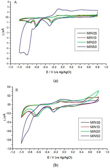 Effect of the immersion time of the CuO/Cu (A) and CuONf/Cu (B) electrodes in 0.1 mol·L−1 NaOH, in the cyclic voltammograms, at 100 mV·s−1.