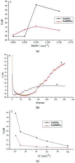 An alkaline medium is required to enhance the electrocatalytic activity of metal oxides. Thus, the effect of NaOH concentration on the electrocatalytic performance of the CuO/Cu and CuONf/Cu sensors on glucose oxidation was tested in 0.05 to 0.15 mol·L−1 NaOH solutions. Increasing NaOH concentration resulted in an increase of the anodic current wave for both sensors, because glucose oxidation is more efficient at high NaOH concentration (Figure 5A). Using the CuO/Cu sensor, when the concentration of NaOH increases above 0.1 mol·L−1, a high background noise was obtained and lots of gas bubbles were observed on the surface of the CuO/Cu sensor, suggesting that oxygen evolution from water oxidation gradually becomes a more important reaction than oxidation of organic pollutants. The results were consistent with the previous experimental observations when an increased background current was observed at high NaOH concentrations. Results of our experiments indicated that, a 0.1 mol·L−1 NaOH solution was optimal for glucose oxidation using the CuONf/Cu sensor. Higher NaOH concentrations reduce the current to very low values.