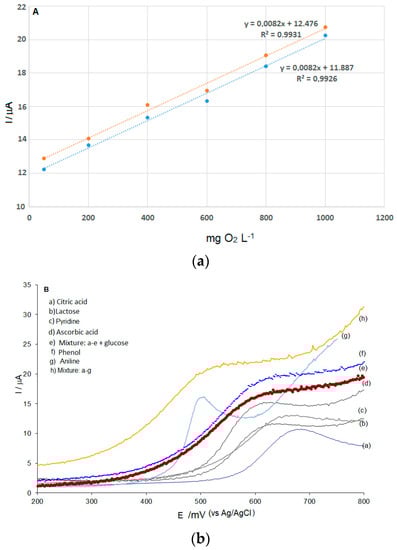 Under optimized conditions, linear range and detection limit were calculated using the CuONf/Cu sensor based on the curve of Figure 3B. It was found that the oxidation current signal is proportional to the concentration of glucose (COD C, mg·L−1 of O2) over the range from 50 to 1000 mg·L−1 as shown in the figure. The linear regression equation is: I / µA = 12.0516 + 9.17 × 10−3 x, R2 = 0.9957, (n = 6). Detection limit calculated based on the 3s criterion measuring a blank solution was 2.11 mg·L−1 (n = 6). To evaluate the linear range and the detection limit of the proposed method, seven organics with known theoretical COD values were selected as standard samples for calibrating the COD measurements (Figure 6A). The results showed that all organic compounds investigated were fitted into a linear equation: I / µA = 8.3 × 10−3 x + 12.48, R = 0.9981, (n = 6). Linear voltammograms were obtained for five different types of standard samples with the same COD value (Figure 6B). The relative standard deviation (RSD) for these measurements was 3.1 (n = 6). These results show that COD measurements by the proposed method were practically independent of the type of organic contaminant causing it. This fact stands for the use of glucose as a valid representative of organic contaminants in water systems, as carried out in this work, and validates its foundations for the quantitative COD determinations described. Based on the above findings, the accuracy of the proposed method was evaluated using a synthetic sample containing 90 mg·L−1 glucose as a standard COD test reagent. Linear voltammograms were obtained using a series of test solutions prepared in the same way. A 4.2 relative standard deviation (RSD) (n = 6) was obtained. The average result obtained after six replicate COD measurements was 91.04 ± 0.09 mg·L−1. Statistical analysis using the Student’s t-test showed that there is no statistical significant difference between the actual and found concentration at the 95% confidence.