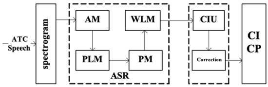 From Figure 1, we can see that the spectrogram is firstly generated from the ATC speech and serves as the input of the ASR model. There are four deep learning-based sub-models in the ASR model, AM, phoneme-based LM (PLM), PM, and word-based LM (WLM). The AM is a typical ASR model whose input and output are the spectrogram and phoneme-based label sequence respectively. Both the PLM and WLM are language models, whose difference is that they use different basic word units to model the context utterance, i.e., phoneme for PLM and word for WLM. The PLM and WLM are applied to revise the output of the AM and PM model based on characteristics of ATC application in this paper. The PM is designed as a ‘machine translation’ system, whose input and output are the phoneme-based label sequence and word-based label sequence, respectively. The CIU model takes ASR results (computer readable texts) as input to detect the controlling intent (CI) and label controlling parameters (CP). Finally, considering the flight information in current ATCSs, a correction procedure is proposed to revise minor mistakes and further improve the applicability and robustness of the sensing framework.