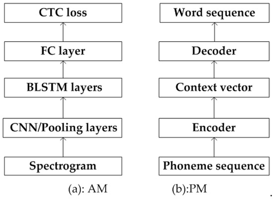 (a) Network of the AM; (b) Network of the PM. FC: fully connected; CTC: Connectionist Temporal Classification; BLSTM: bidirectional long-short term memory.