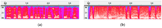 (a) Spectrogram of an ATC speech segment; (b) Spectrogram of another ATC speech segment collected from the same transmission channel with (a).