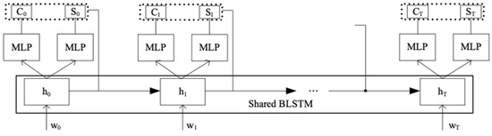 where and are pre-defined ones based on the ATC application in this work. By analyzing similarities of the two tasks, we propose a BLSTM joint model to solve them in one neural network, whose core block is sketched in Figure 5. Consequently, the basic problem can be refined as (7) and (8), in which the history outputs (CI and CP) are also considered for predicting the current CI and CP labels. After labelling controlling parameters from ASR results for the ATC speech, we also propose a correction procedure based on the flight information in current ATCSs to improve the performance of the proposed sensing framework.