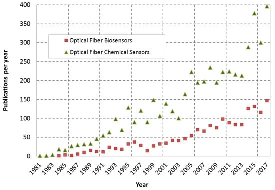 Evolution of the number of publications per year in the optical fiber biosensors and optical fiber chemical sensors research fields (source: Scopus).