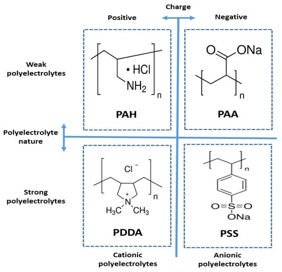 Polyelectrolytes are polymers with ionizable functional groups that form charged polyions (with overall positive or negative charge), thus constituting either polycations or polyanions, respectively. According to this, a substance with positively charged functional groups (mostly quaternary ammonium or amino groups) is used as a polycation, being the most significant examples poly(allylamine hydrochloride) (PAH), polydiallyldimethylammonium chloride (PDDA) and poly(ethyleneimine) (PEI); whereas a substance with negatively charged groups (mostly sulfonic acids or carboxylic acids) are the most common functional groups used in polyanions, being the most common examples poly(sodium 4-styrene sulfonate) (PSS) and poly(acrylic acid sodium salt) (PAA). In addition, an important aspect to remark related to these polyelectrolytes is that these charged polymers can be classified as strong or weak polyelectrolytes, respectively. According to this classification, polyelectrolytes that maintain a high and constant ionization ratio over a broad range of pH conditions are termed as “strong polyelectrolytes” (being the most representative examples PDDA or PSS), whereas polyelectrolytes that exhibit pH-dependent ionization degrees are called “weak polyelectrolytes” (being the most known examples PAH or PAA), respectively. A summary of the chemical structure (constitutional repetitive unit) of the most common polyelectrolytes used for the fabrication of a multilayer structure by the LbL technique can be appreciated in Figure 3. Other important aspect to consider is that a long list of other different positive or negative polyelectrolytes which can be also employed for the buildup of thin films can be found in the literature, being some representative examples poly(vinyl pyridine) (PVP), poly(vinyl sulfate (PVS), poly((2-(methacryloyloxy)ethyl) trimethylammonium chloride) (PCM), poly- (phenylene vinylene) (PPV), poly(methacrylic acid) (PMA), poly(sodium phosphate) (PSP), sulfonated polyaniline (SPAN), or poly(4-vinylbenzyltrimethylammonium chloride) (PVBTA), among others.