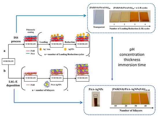 An important consideration related to the LbL technique is that it can be implemented on a wide variety of different materials (not only polyelectrolytes), making possible the fabrication of advanced LbL coatings. According to this, a wide number of scientific research papers based on the incorporation of metal nanoparticles [,,,,], carbon nanotubes [,], metallic oxide nanoparticles (silica, titania) [,,,,], organic dyes [], polypeptides [], proteins [,], DNA [], dendrimers [], or quantum dots [,], among others, can be found in the literature. A representative example of this high versatility is shown in Figure 5 where two different chemical approaches denoted as the in situ synthesis (ISS) process and LbL embedding (LbL-E) deposition technique are used for the incorporation of metallic silver nanoparticles (AgNPs) into LbL films [].