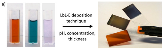 (a) Multicolored silver nanoparticles (PAA-AgNPs) (orange, green and violet) used for the LbL-E deposition technique and the final aspect of the multicolored LbL-E thin films [PAH/PAA-AgNPs]80 with orange, green and violet coloration, respectively; (b) Aspect of the PAA-AgNPs with a spherical shape (orange), hexagonal shape (green) and rod shape (violet). Reprinted from [] with permission.