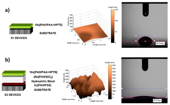 Schematic representation of the coating fabrication by using the LbL technique (left), AFM images of the corresponding coatings (middle) and contact angle measurements (right) for S1 device (a) and S2 device (b), respectively. Reprinted from [] with permission.