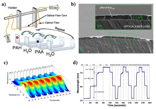 In order to perform the experimental procedure, first of all, the substrate (optical fiber) is cleaned and treated to create an electrically charged surface, for instance a negative charged surface. Then, the substrate is exposed to a solution of a polycation for a short period of time (minutes) and as a result, a monolayer of polycation is adsorbed by electrostatic attraction on the surface, reversing the original electrical charge. After that, the substrate is immersed into a solution of polyanion and, by adsorption of a monolayer of polyanions, and as a result, the original negative charged surface is restored. In this way, the substrate is alternately dipped into solutions of cationic and anionic polymers in order to create a multilayer thin film. The pair of one cationic monolayer and one anionic monolayer is called bilayer. Additionally, after each immersion in the dipping polyelectrolyte solution, the substrate is rinsed with ultrapure water in order to remove the excess of non-adsorbed material onto the substrate. This process can be repeated up to the desired thickness as a function of number of bilayers during the fabrication process. Other aspect to remark is that a number of parameters have to be perfectly controlled in order to achieve repeatable thin films, such as concentration of the dipping polyelectrolytes solutions, pH, curing temperature, immersion time, and ionic strength, among others [,,,].