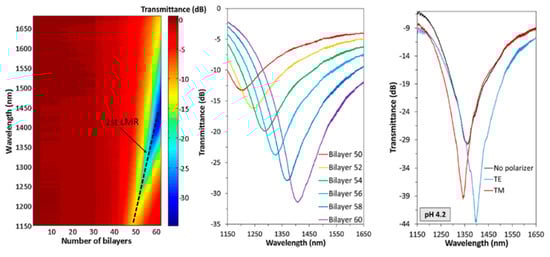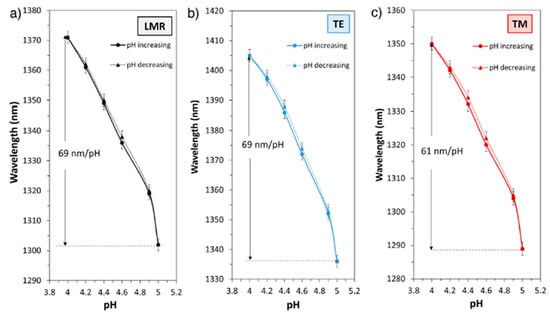 Further studies have been focused on the use of this same pH sensitive coating of (PAH/PAA), although it has been implemented over other different optical fiber configurations [,,,,,]. A representative example can be found in [] where a high sensitive optical fiber pH sensor based on the combination of both tapered single-mode optical fibers (T-SMF) and LMR phenomenon for pH detection is presented, reaching a wavelength shift of 200 nm within the pH range from 4.0 to 6.0, respectively. Other interesting works can be found in [,] where LMR supporting coatings (PAH/PAA) are deposited onto D-shaped optical fibers, showing an optical wavelength shift of the LMR when the pH is increased with 0.2 pH variations. Another advantage related to the LMR phenomenon is that it can be generated with both transverse electric (TE) and transverse magnetic (TM) polarization light and they can be tuned to different wavelengths of the spectrum []. A representative example related to both LMRTM and LMRTE can be found in [] where the sensitivities of the LMRTM and LMRTE in two pH ranges (from 4.0 to 5.0 and from 7.0 to 8.0) have been measured by using two different devices fabricated by PAH/PAA polymer chains at pH 7.0 (device A) and at pH 4.0 (device B). The experimental results indicate that best sensitivity with a low hysteresis (0.04%) has been obtained for device B, being for LMRTM (61 nm/pH) and LMRTE (69 nm/pH) in the pH range from 4.0 to 5.0 in comparison with the device A with a sensitivity of 30 nm/pH (LMRTM) and 34 nm/pH (LMRTE) in the pH range from 7.0 to 8.0, respectively. In addition, the monitoring of both LMRTM and LMRTE resonances makes possible to perform dual measurements, which could be helpful to reduce noise or extend the dynamic range of the devices. In Figure 10, the evolution of the transmitted spectra during the fabrication process as well as the transmittance obtained with the device B (black line) with its corresponding separation of LMRTM resonance (red line) and LMRTE resonance (blue line) when the sensitive region is immersed in a pH solution of pH 4.2 is presented. In Figure 11, the resonance wavelength shift of the device B when the sensitive region is immersed in different pH solutions for LMR (without polarization controller), LMRTE and LMRTM, respectively, is presented.