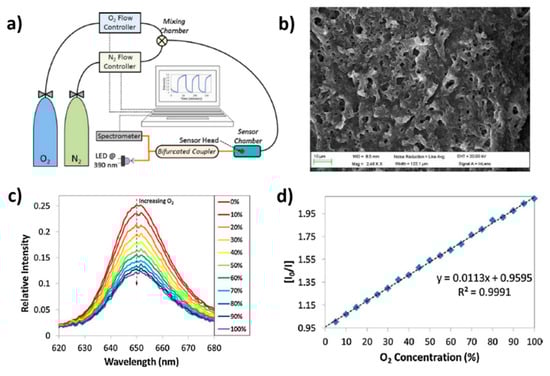 (a) Experimental set up used to characterize the sensor. The flow controllers are electronically tuned by software; (b) SEM image of the resultant coating obtained from an optical fiber once the construction process has been performed; (c) Luminescence signal from the sensor when it is exposed to different oxygen concentrations; (d) Stern–Volmer plot obtained from the sensor for increasing oxygen 5% steps. Reprinted from [] with permission.