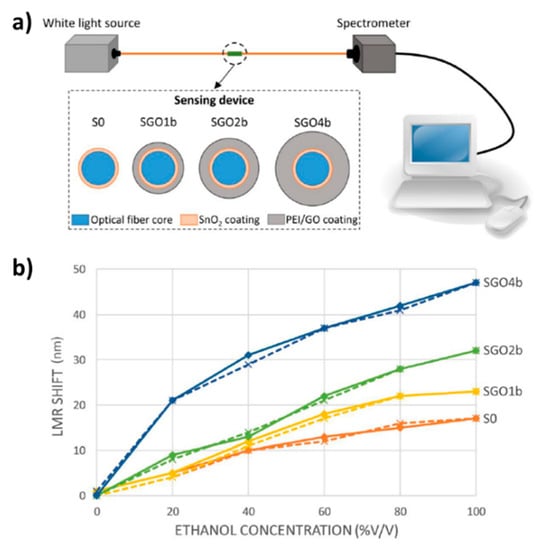 (a) Optical fiber experimental setup and sensors schematic structure; (b) Shift of LMR absorption peak generated by the four different sensors when they are immersed in ethanol solutions with different concentrations from 0 to 100% v/v (straight lines) and from 100 to 0% v/v (dashed lines). Reprinted from [] with permission.