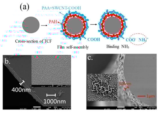 (a) Cross-sectional view of the TCF section; (b) The scanning electronic microscope (SEM) image of the cross-section of the fiber coated with (PAA/PAH)10 film. The inset shows the surface morphology; (c) SEM image of the cross-section of the fiber coated with (PAH/PAA)2 + [PAH/(PAA + SWCNTs-COOH)]8 film. The inset shows the surface morphology. Reprinted from [] with permission.