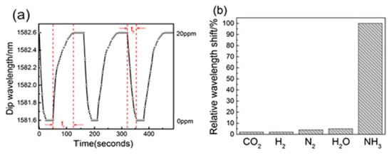 (a) Dynamic responses of the thin-core fiber interferometer ammonia sensor; (b) Relative wavelength shifts of the transmission spectrum of the TCF when is exposed to ammonia and other analytes (CO2, H2, N2 or H2O). Reprinted from [] with permission.