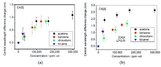 Another interesting work for detection of specific volatile organic compounds (VOCs) such as chloroform and benzene vapors can be found in []. In this work, an optical fiber long period grating with a calixarene-anchored mesoporous thin film has been used for VOC detection. The mesoporous film consisted of an inorganic part (SiO2NPs) along with an organic moiety of PAH which has been infused with the functional compound p-sulphanatocalix[4]arene (CA[4]). The presence of CA[4] receptor into the LbL films allows sensitive measurements of VOCs with high reversibility and rapid response times. The sensing mechanism is based on the measurement of the refractive index change induced by the complexation of the VOCs with the CA[4] receptor. This same sensing mechanism has been used in [], although in this work two different sizes of calixarene molecules such as CA[4] and CA[8], respectively, have been employed for the detection of individual VOCs and their mixtures evaporating from freshly painted surfaces. The experimental results indicate that although neither of the sensors can discriminate between individual VOCs, a different response has been observed to two different commercial paint products, suggesting that the sensors can distinguish between different mixtures. In addition, the CA[8] sensor exhibited a smaller response than CA[4], which is most likely a result of the lower amount of CA[8] infused into the PAH/SiO2 films. As it can be observed in Figure 19, the biggest wavelength shift has been observed for acetone, whereas the lowest wavelength shift has been observed for chloroform in the CA[4] sensor. In addition, no differences have been observed between individual VOCs for the CA[8] sensor.